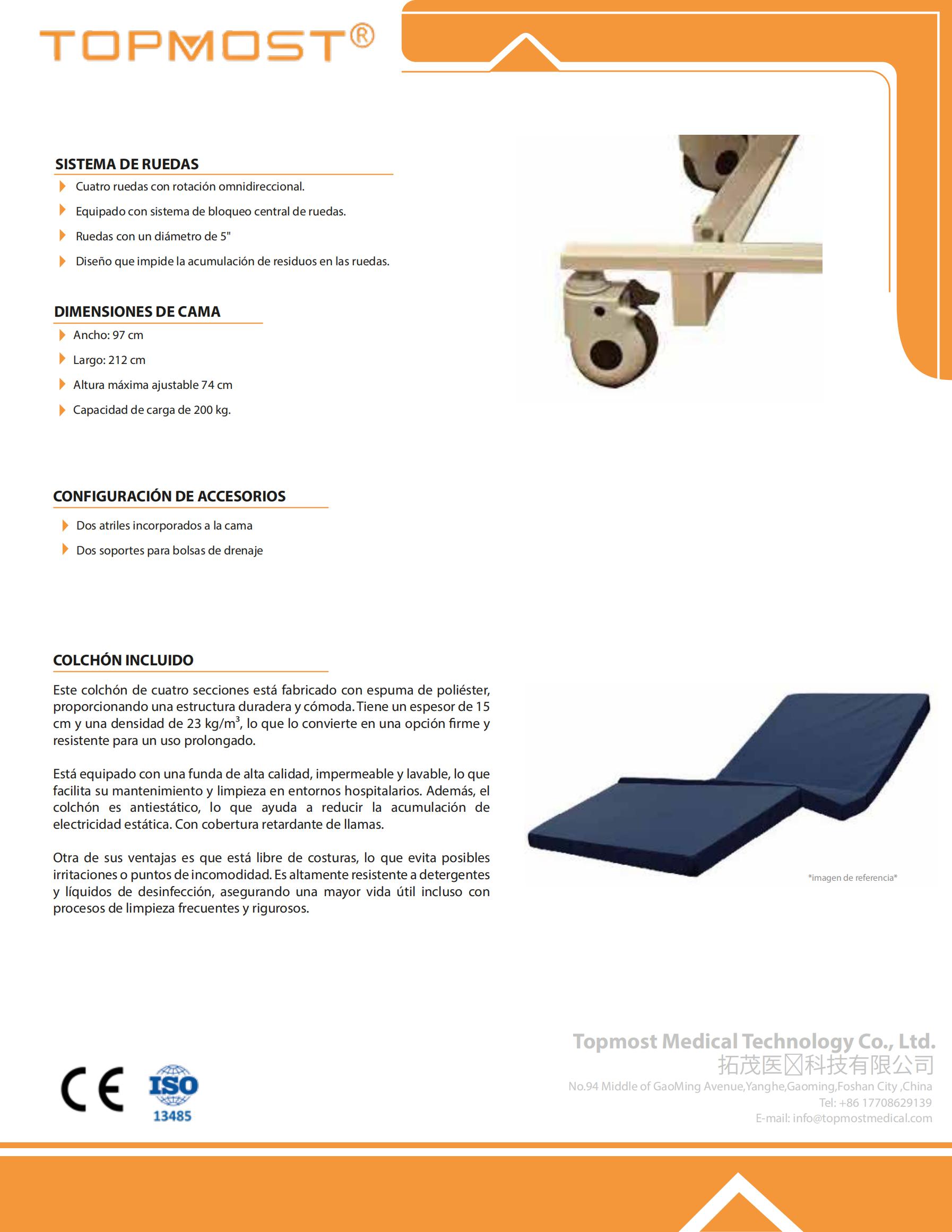 • Аксессуары: 1 регулируемая по высоте стойка для внутривенных вливаний из нержавеющей стали / 4 крючка для мочеприемников; 4 отверстия для внутривенных вливаний