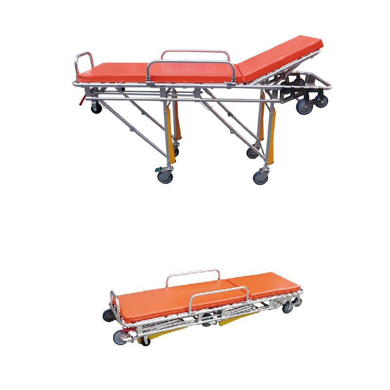 Материал: алюминиевый сплав, фурнитура: литье из алюминия, складная механическая конструкция, управление с помощью левой и правой ручек, один человек может управлять носилками, толкая их в машине скорой помощи, используется губчатая подушка, регулируемый угол наклона спинки, фиксирующий кронштейн крепится к машине скорой помощи, и носилки можно зафиксировать после установки на платформу.